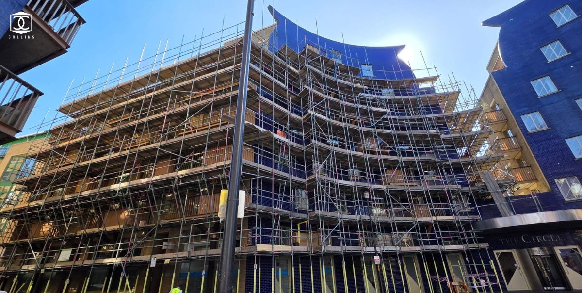 Scaffolding is progressing well to the front elevations of ‘The Circle’.